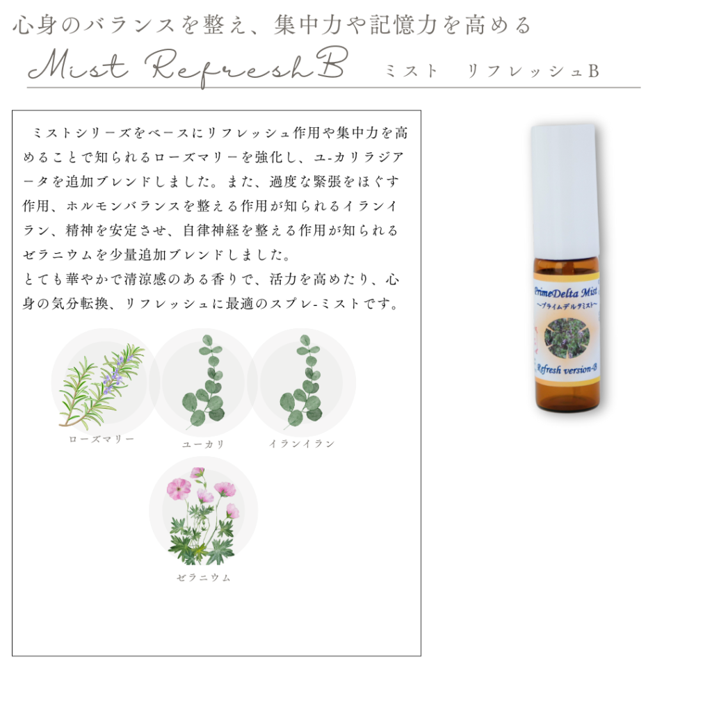 プライムデルタミストシリ-ズは、エッセンシャルオイルのみで消臭作用と除菌作用をを持たせ、加えてリフレッシュ作用やリラックス作用など香りの作用を十分に活かしている製品です。ティ-トリ-油、ペパ-ミント油、ロ-ズマリ-油をベースにリラックス&リフレッシュを目的に、精油を厳選してブレンドしました。また自然の香りで強力な消臭・除菌作用をもたせました。