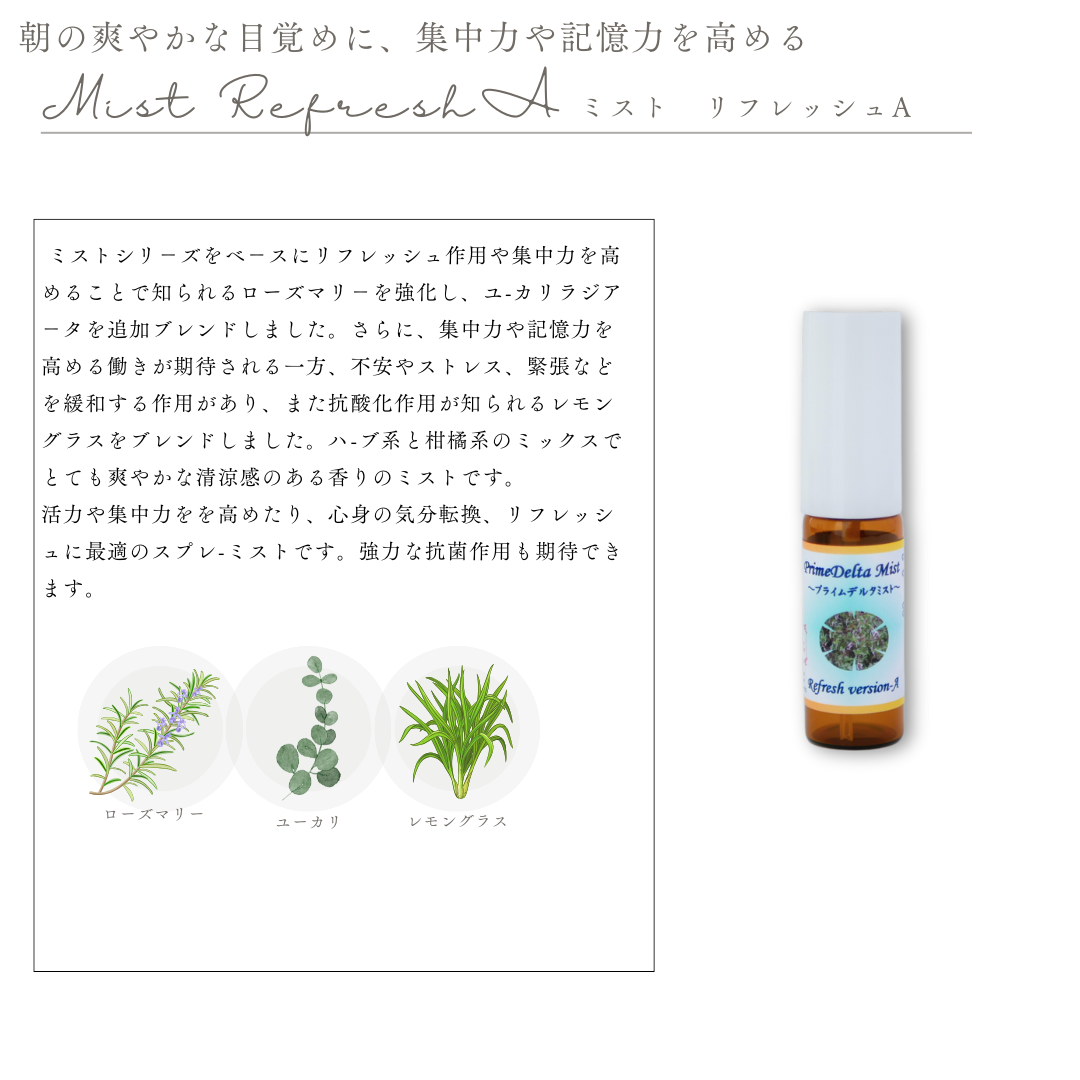 プライムデルタミストシリ-ズは、エッセンシャルオイルのみで消臭作用と除菌作用をを持たせ、加えてリフレッシュ作用やリラックス作用など香りの作用を十分に活かしている製品です。ティ-トリ-油、ペパ-ミント油、ロ-ズマリ-油をベースにリラックス&リフレッシュを目的に、精油を厳選してブレンドしました。また自然の香りで強力な消臭・除菌作用をもたせました。